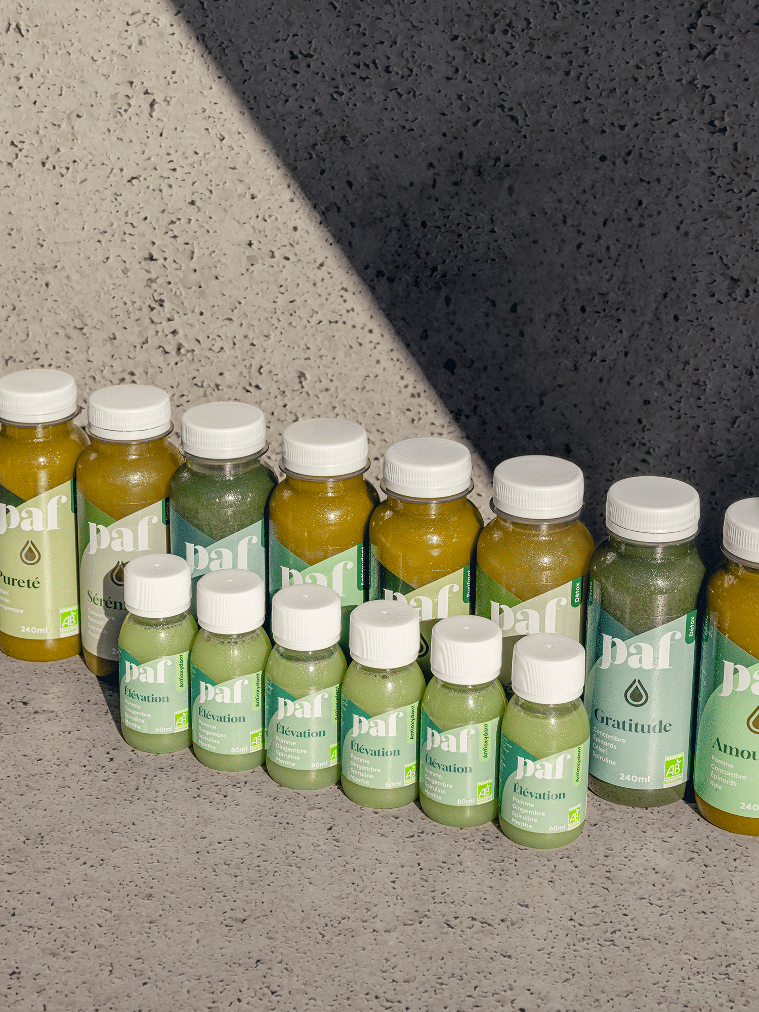 Chez PAF les matières premières sont 100% bio et rigoureusement sélectionnées afin de vous offrir un jus frais comme à la maison, la praticité et l’expertise en plus. Chaque bouteille de 240 ml contient environ 500g de fruits et légumes bio pressés (près d’un demi kilo !), soit l’équivalent de 6 portions, alors que l’OMS nous recommande d’en consommer au moins 5 par jour. Avec un jus PAF vous couvrez l’ensemble des apports nutritionnels dont votre corps a besoin dans une journée.